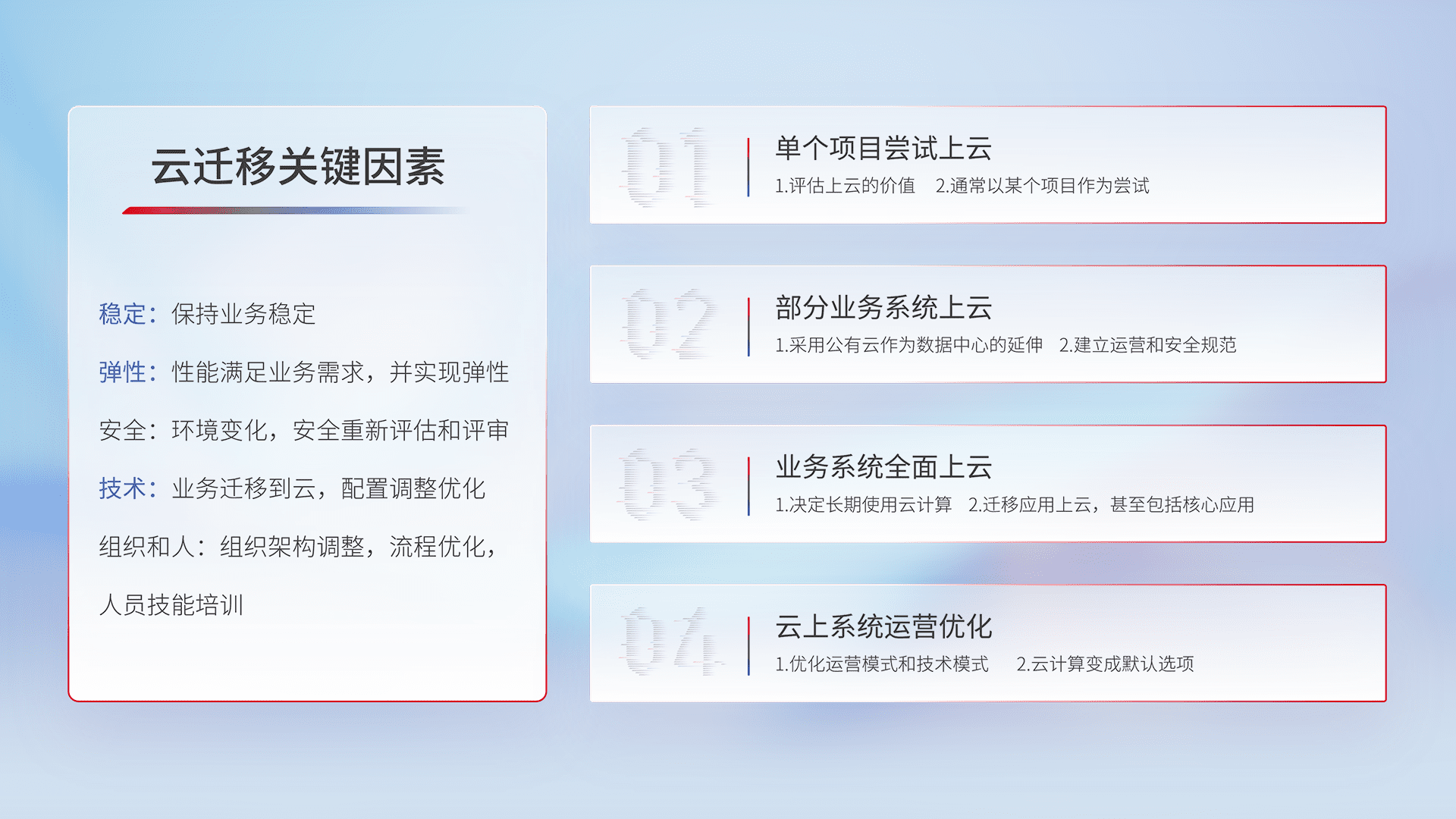 结合实际业务,,,,从规划设计、、、、云平台选型、、、云原生改造、、、数据迁移、、集成交付,,,迁移全过程为客户识别最佳上云路径,,做好风险识别管理,,设计网络架构、、身份权限、、、安全审计合规、、、操作审计、、、日志审计、、、监控告警策略、、、多站点容灾设计等,,,,对云上基础设施进行整体规划,,提升IT治理水平,,,,以满足弹性、、高可用、、、、高性能的需求。。。