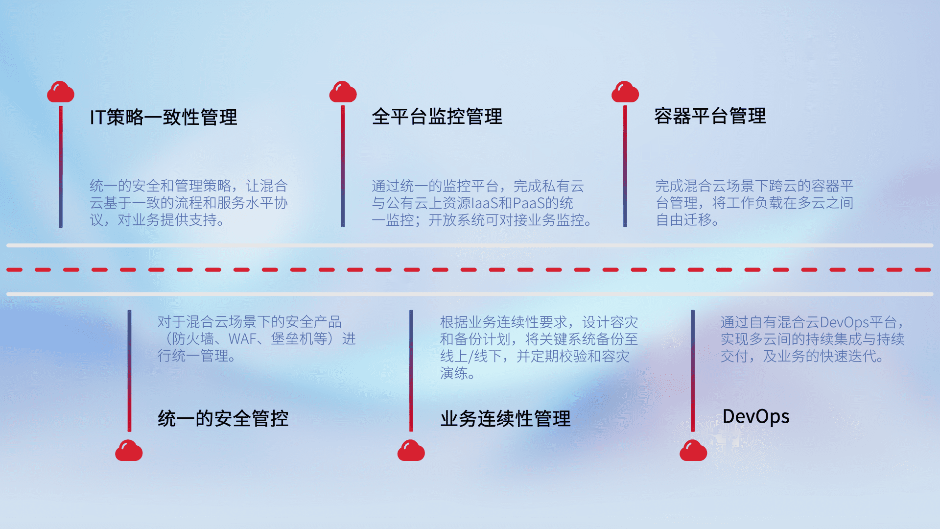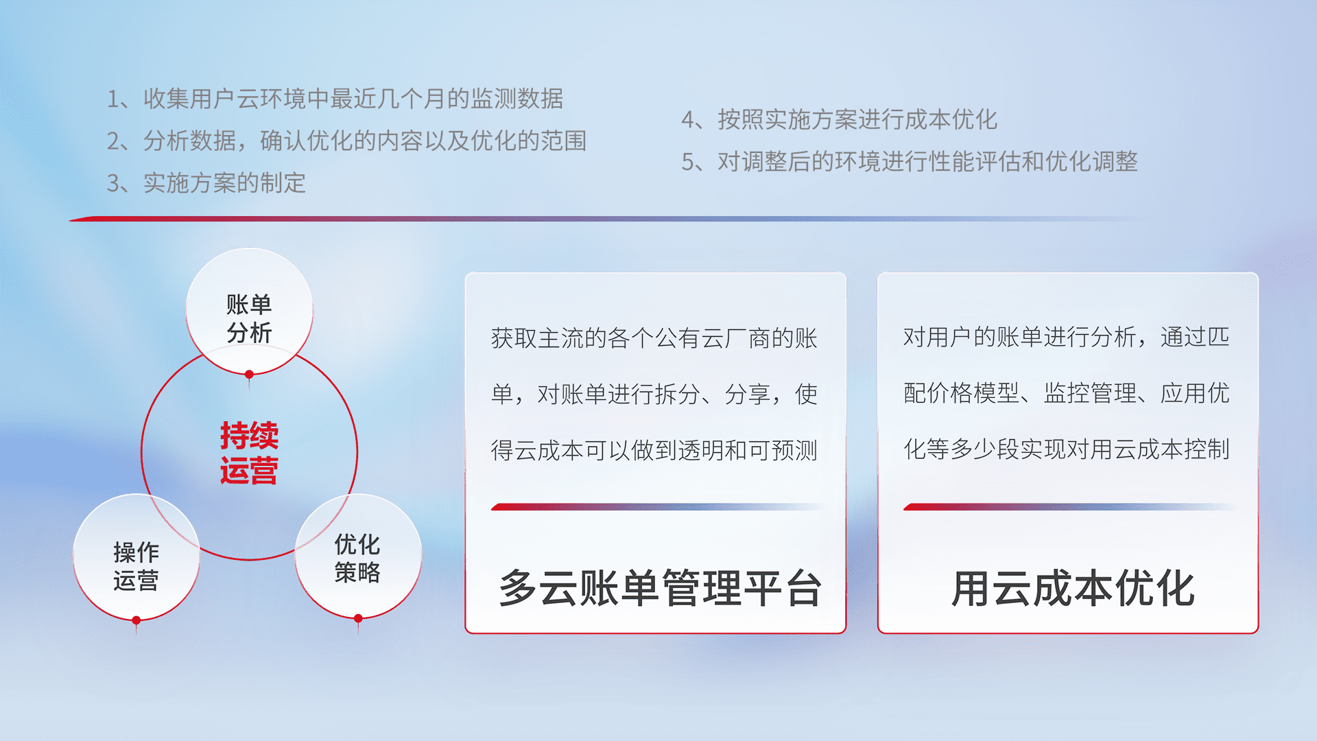 通过多云纳管,,,以统一的资源数据模型把客户的云资源进行抽象和封装,,进而实现对多云资源的统一操作,,保障云资源管理的可靠性、、稳定性与可用性。。。。量身定制化运维内容,,,,配置、、、开发运维、、补丁管理、、、备份、、、、监控、、、认证和访问管理、、、审计和日常巡检等,,保障在用云过程中的可靠度,,,稳定度以及高可用率。。