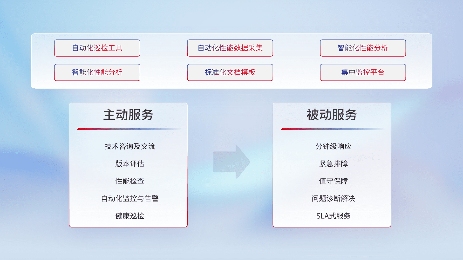 智能化工具和标准化文档,,,,保障服务质量,,,,提供主动服务(包含技术咨询、、、、版本评估、、、、性能检查、、、自动化监控与告警、、健康巡检)和被动服务包含(分钟级响应、、、紧急排障、、值守保障、、、问题诊断解决、、SLA服务)。。