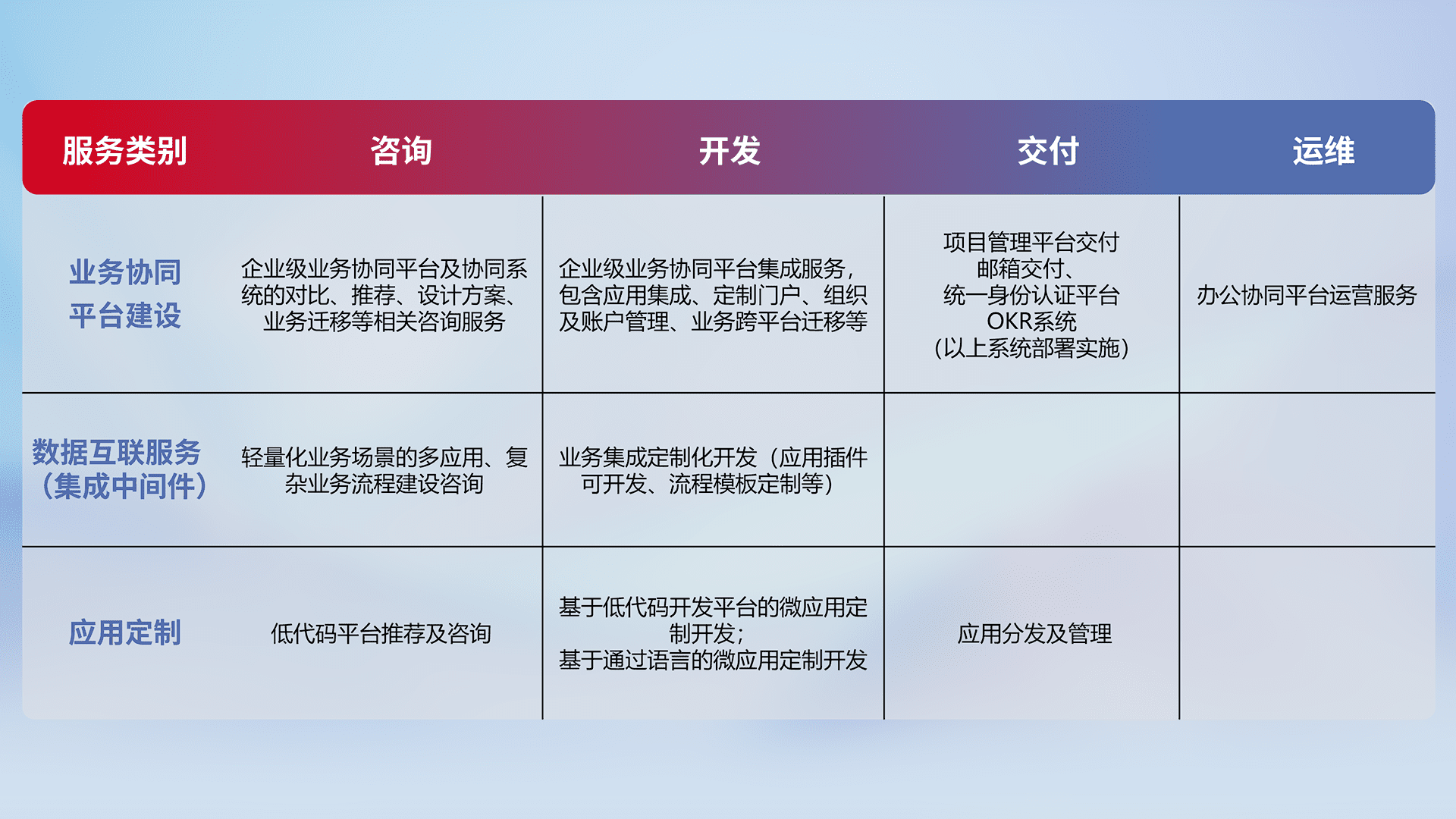 针对钉钉、、企微、、IDaas等平台级产品提供产品的规划、、方案、、交付、、定制化开发等服务,,实现如统一协同办公、、智能客户服务、、混合会议管理、、智能数据查询、、、等业务场景,,,实现数字化转型。。。。